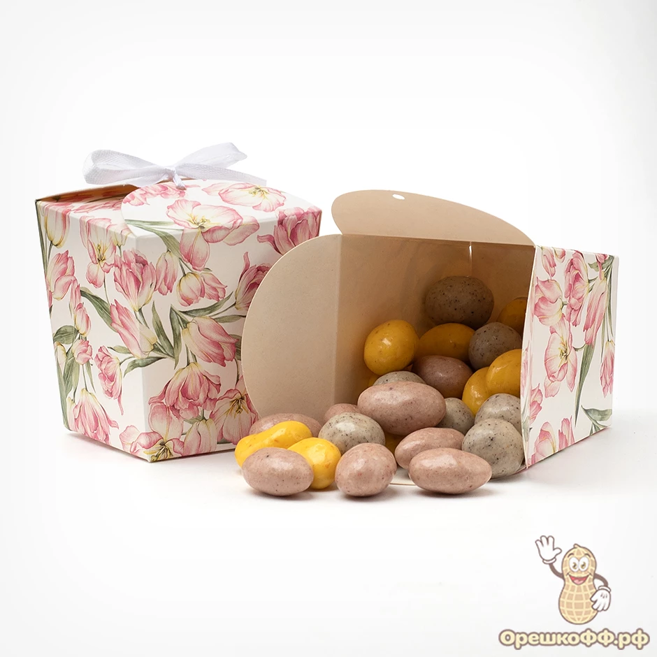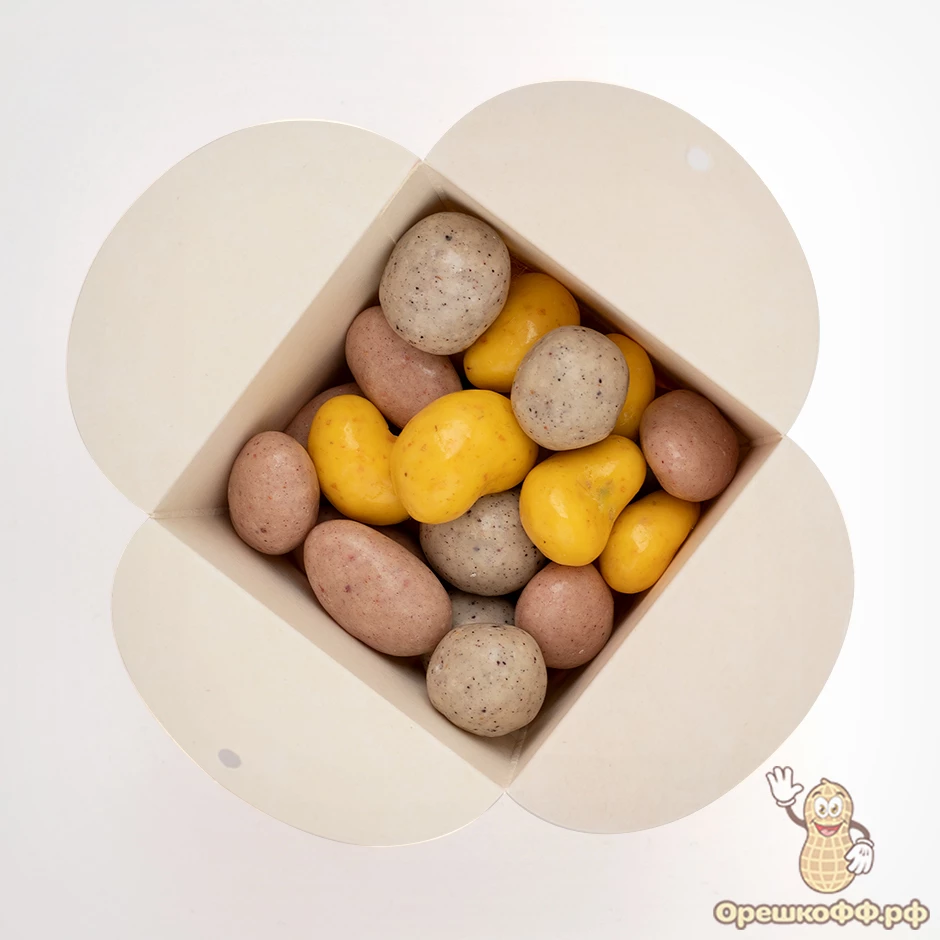 Драже кешью в шоколадной глазури с натуральным творогом и сублимированной облепихой: шоколадная глазурь белая (сахар, какао-масло, молоко сухое цельное, сухая молочная сыворотка, эквивалент какао-масла, эмульгаторы (рапсовый лецитин), творог натуральный сухой (молоко восстановленное из сухого обезжиренного молока и цельного молока, заквасочная культура на основе Streptococcus salivarius ssp. thermophilus, Lactococcus lactis subsp. cremoris, Lactococcus lactis subsp. lactis, Lactococcus lactis subsp. lactis biovar diacetylactis), ядро ореха кешью жареного, глазирователь, облепиха сублимированная, глазирователь (смола гуммилак))