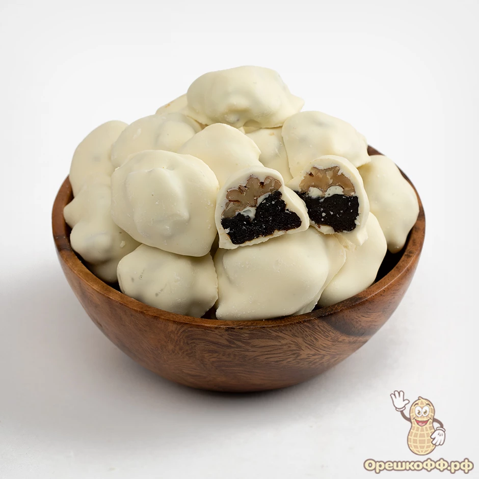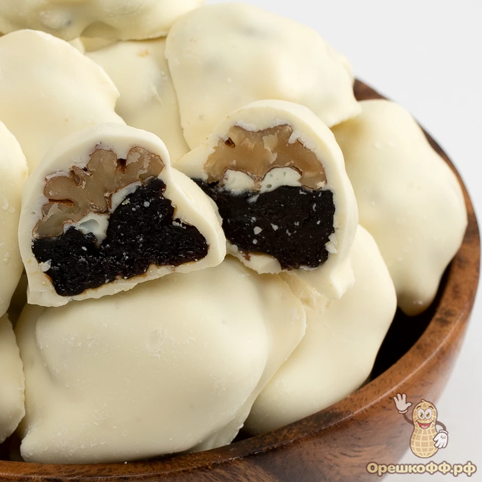 слива сушеная без косточки, грецкий орех, шоколадная глазурь белая (сахар, какао-масло, сухие молочные продукты, эмульгатор - лецитин, ароматизатор идентичный натуральному - ванилин).