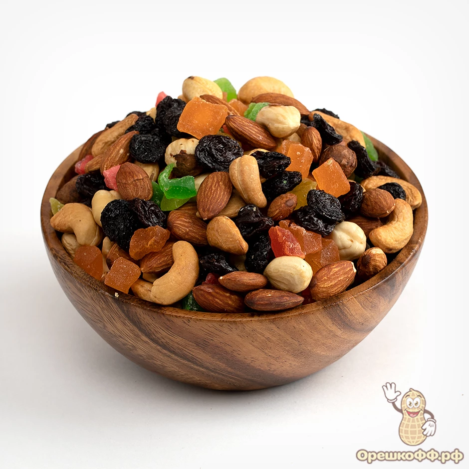 Фруктово-ореховая смесь жареная — это отличное сочетание различных видов орехов и цукатов. В её составе: 3 вида жареных орехов, изюм и ананас в форме кубиков. Фруктово-ореховая смесь считается вкусным и полезным продуктом, который можно употреблять даже на ежедневной основе. Её удобно брать с собой в дорогу, на работу или в путешествие.