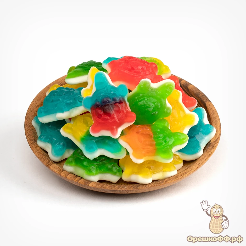 сироп глюкозы, сахар, желатин, пектин; вода, увлажнитель: сорбит, регуляторы кислотности: лимонная кислота, молочная кислота, лактат натрия; ароматизаторы идентичные натуральным, глазирующий агент: пчелиный воск, карнаубский воск; красители: тартразин, желтый «Солнечный закат», красный очаровательный АС, синий блестящий FCF, диоксид титана