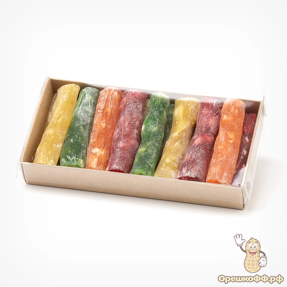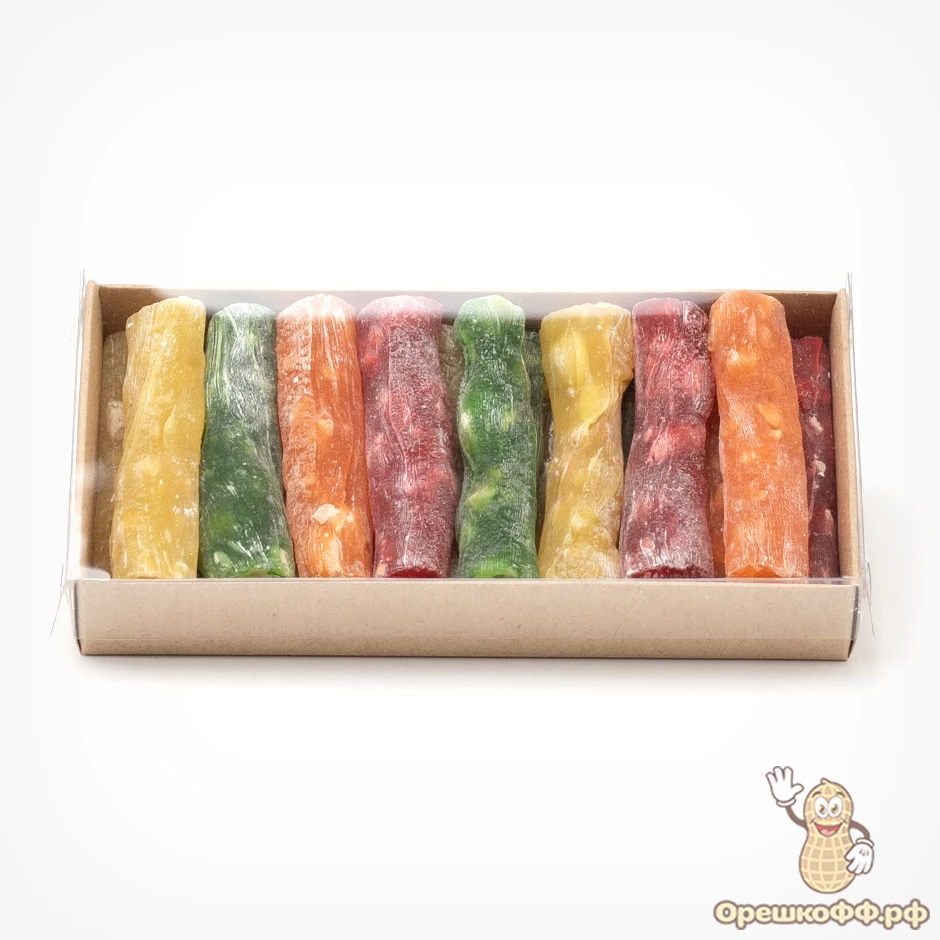 сахар, крахмал кукурузный, ядро арахиса жаренное, регулятор кислотности, ароматизаторы ("Апельсин", "Барбарис", "Яблоко", "Лимон"), красители (Е124, Е102, Е110, Е133)
